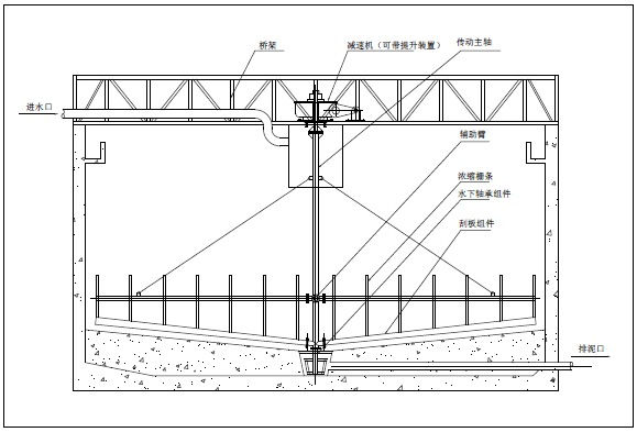 含有細粒物體的料漿或污水,經槽架或污泥管給入濃縮池的中心部位,料漿做均勻輻射狀向周邊緩慢流動,在溫游中料漿或污水中的固體顆粒籍自重或絮凝作用而沉降。由于濃度較低,顆粒基本做自有沉降,沉速較快,繼而沉入濃集帶,沉速較慢。沉到下部一沉積帶,也是濃度較高的壓縮區,水分從沉降顆粒的間隙中不斷析出。中耙架連續回轉時,耙齒對該部沉積物沿池底的錐形坡面逐級推向池底的中心處,由該處的排料口排出。中耙齒推進沉積物時,也是刮板對沉積物的一個壓縮過程,這也大大的促使析水作用的加強,因而從排料口排出的沉積物時經過濃縮的料漿或污泥。池上部是澄清帶,澄清液從池邊溢流堰排出,從而構成濃縮機工作的全過程。