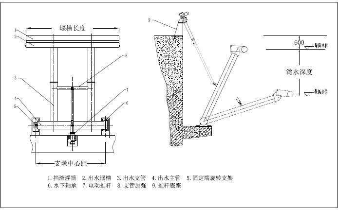 XB旋轉(zhuǎn)式潷水器主要由電控箱、電動推桿、潷水主管及支管、堰槽組件、浮筒組件、出水組件、行程控制、底座等部分組成。旋轉(zhuǎn)式潷水器由電動推桿把水下部分與執(zhí)行機構(gòu)連接起來,當需要排水時,中央控制系統(tǒng)會給出信號,指令電機驅(qū)動螺桿旋轉(zhuǎn),電動推桿向前推出,集水堰槽隨水平管的轉(zhuǎn)動而下降,開始潷水,排出的上清液由排水管排出,當潷水結(jié)束后,推桿內(nèi)計數(shù)器給出信號,電機反轉(zhuǎn),牽引集水堰槽上移,回到預(yù)置位置,等待完成下一個循環(huán)。